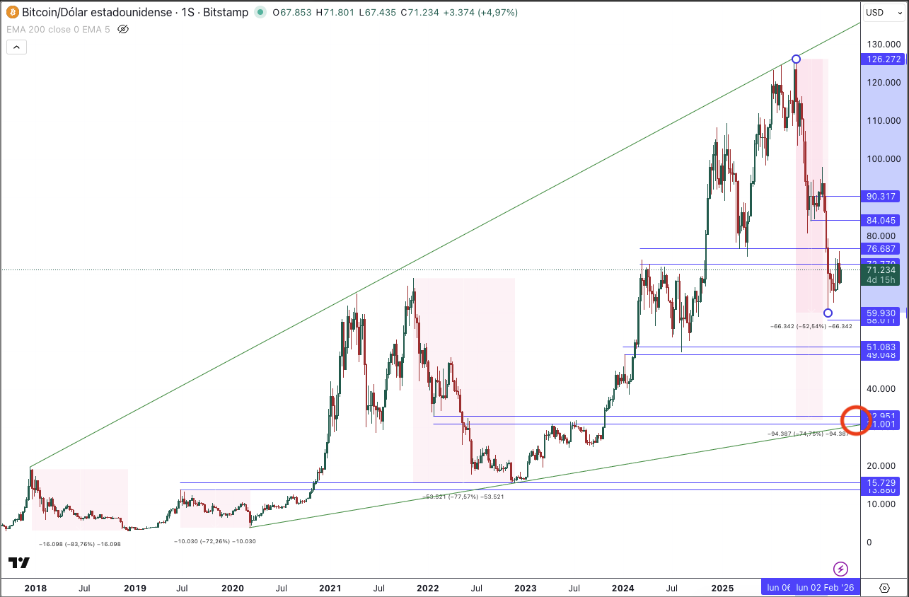Looking at the weekly chart, the current maximum drawdown stands at approximately 52%, which is significantly shallower than previous corrections that ranged between 72% and 83%.